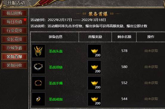 【活动内容】:活动期间率先击杀怪物,爆出装备可获得高额奖励,爆出立即计数,看谁白嫖的奖励最多!
