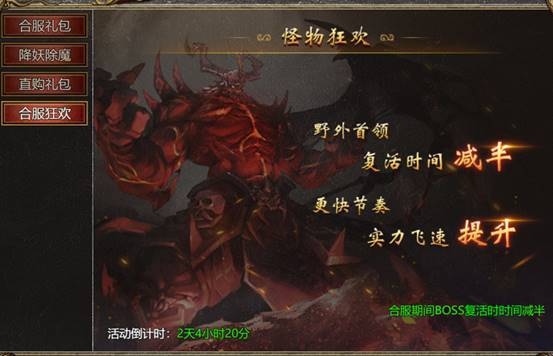 【活动内容】:活动期间,怪物狂欢,野外首领复活时间减半